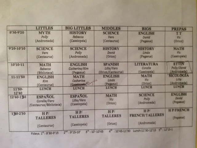Everything you want to know about Coconut and J's school day. The subjects, teachers, classrooms (the five classrooms are named after constellations), and time. Coconut said she liked this school better than her prior one. We have a really good feeling about this school.
